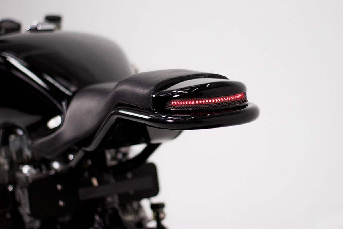 The monoshock conversion also meant a new rear subframe. So Colin designed and fabricated one that also neatly houses the electronics and the battery, despite the slim silhouette. The taillight is an integrated LED hidden behind the perforated plate in the tail section.