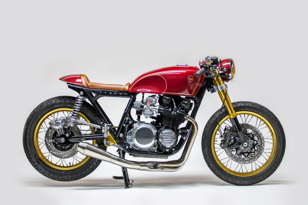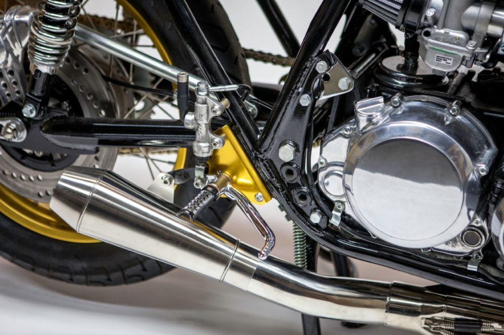 Now it was time to turn attention to that four-cylinder engine and already a rev hungry beast, Dustin happily reports “the CR carbs really woke this machine up!” To help the motor breathe they wear pod filters and the crankcase vents through its own. While on the exhaust side of the equation a four into one system with a Cone Engineering muffler looks as good as it performs. The engine has been given a major makeover in the visual department too and the polished covers match the custom rearsets.