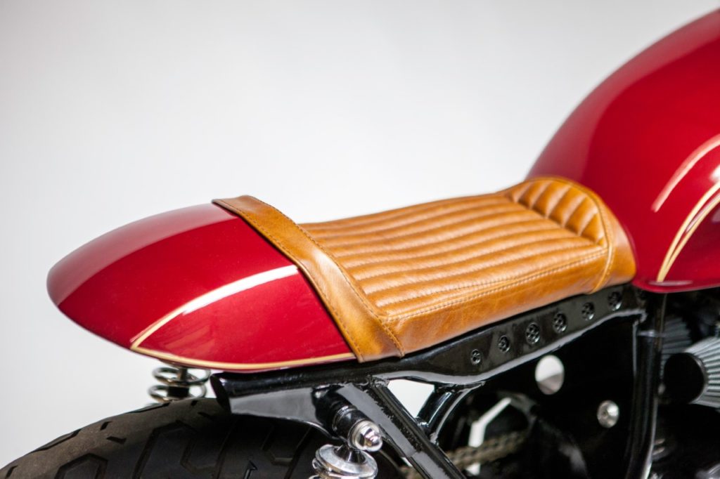 The rest of the components come in the form of Sun rims in gold and a brand new set of spokes. At the rear, Dustin had to get creative to craft the look he was after, and here a familiar friend makes an appearance. A CB750 Supersport donates its entire swingarm and rear hub assembly so that a spoked rim could be run at the back end. Keen eyes may have picked it up when they saw the photos. The rest of the rear is finished out with a drilled disc and high mounted caliper, and some tasty chromed springs on the new shocks.