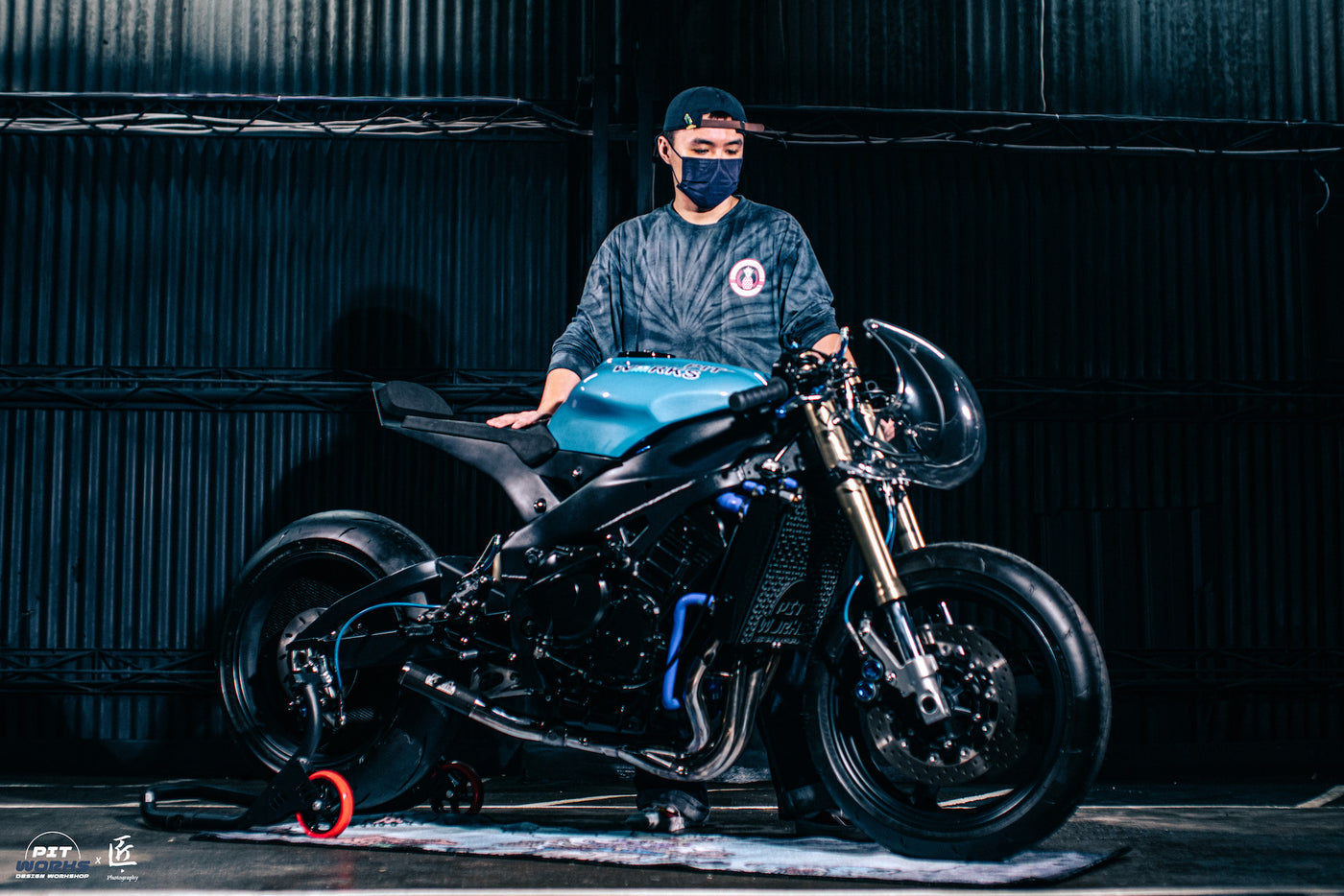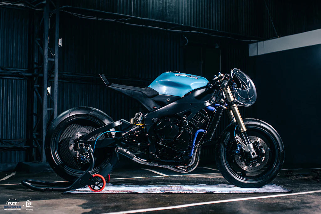 He aims to exude his creativity with designs based on vintage classics whilst infusing modern technology. The latest project out of their garage is 'Blue Ghost', a NEO YZF R1 redesign project.