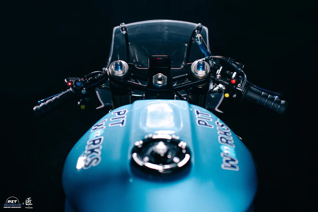 Blue Ghost's steel fuel tank was modified based on the 1998 YZF R1, making it more modern and fit closer to the frame. The steel tank cell prevents rust, whilst the aluminium cast fuel tank ring is a tribute to Ted's old endurance racing bike. Although modified, Ted wanted to keep some of the shape and classical elements of the first-generation superbike YZF R1.