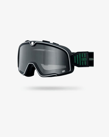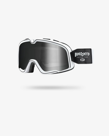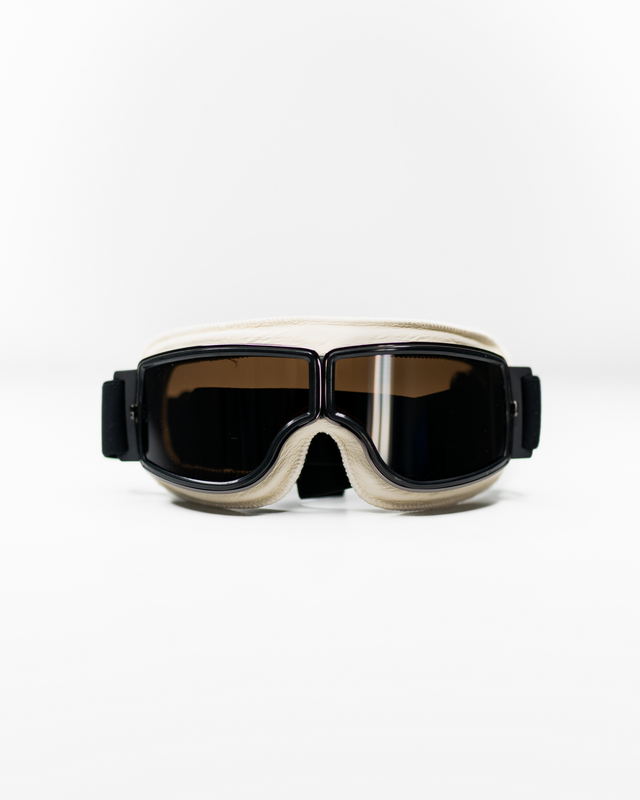 Our Salt Racer Goggle is a vintage aviator inspired goggles that combines C39 smash proof lenses with a soft faux leather trim. The result is a stylish retro style modern goggle, perfect for any of our open face or full face non visor helmets. The inner surface of our White Salt Racer Goggle is made from comfortable moisture wicking white faux leather resulting in unmatched comfort, whilst the outer surface has been specially treated to provide enhanced weatherproofing. The cylindrical lenses provide perfect visibility, an anti fog treatment is also applied plus total UV protection. Increased side venting ensures balance in all conditions. This one size fits most goggle also features a double buckle headband has easy adjustment to keep it in place on the rider's helmet.