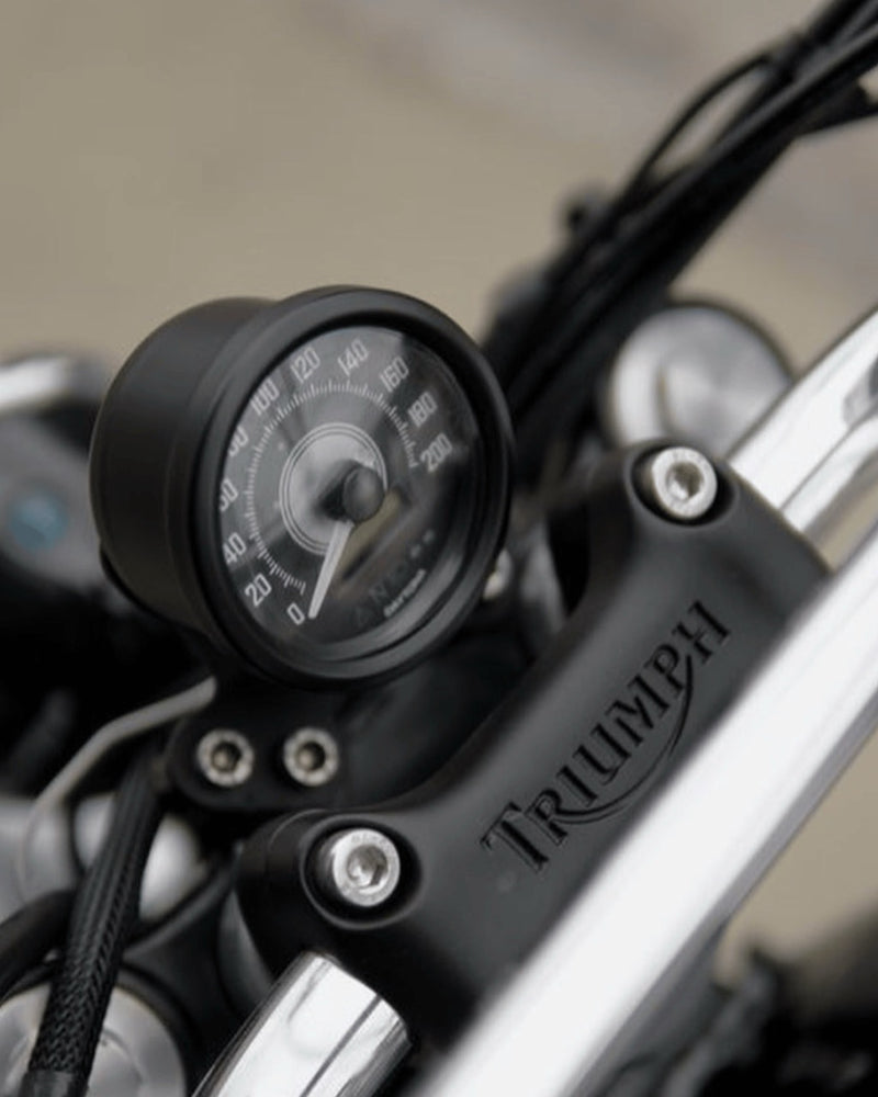 The Daytona Velona 60 Black Speedo & Tacho Gauge Kit delivers a sleek, compact design with just a 43mm body height and a curved dial lens for clear visibility of key readings. Its LCD screen shows vital data complemented with a clean analogue-style display ideal for both contemporary and vintage motorcycles. The Daytona Velona 60 Black Speedo & Tacho Gauge Kit includes pre-wired speedometer and tachometer gauges, extra wiring, and two anti-vibration mounting brackets with hardware and rubber spacers for secure installation.