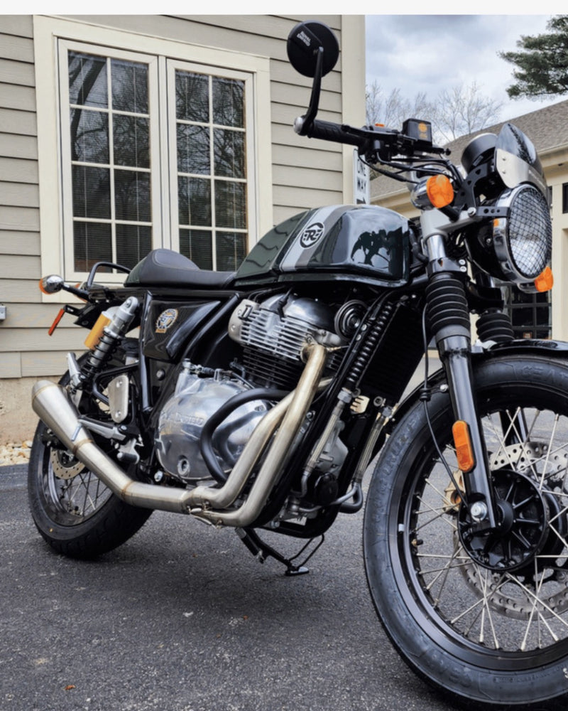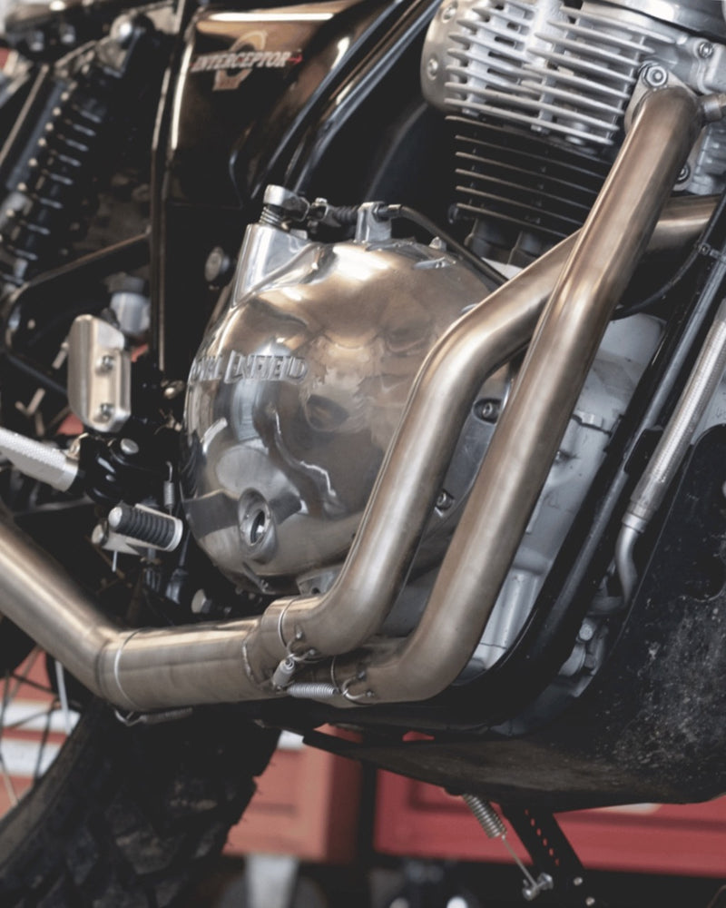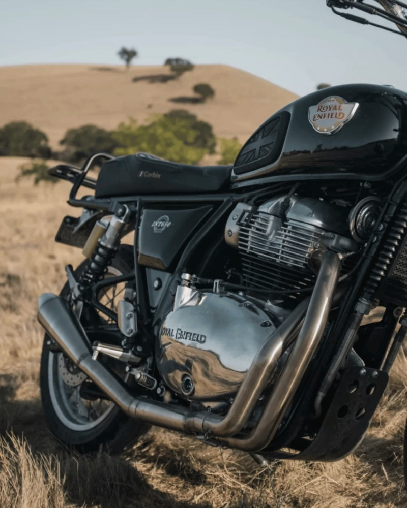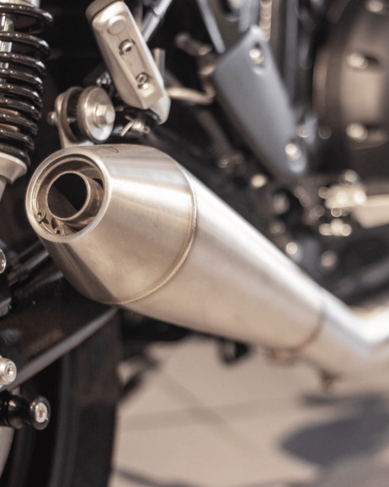 Crafted entirely from 304 stainless steel, the TEC 2 into 1 Stinger full exhaust system is an excellent upgrade for any Royal Enfield Interceptor & Continental GT650. The Stinger's uniquely engineered baffle design within the silencer and mid pipe delivers an impressive sound and improved airflow, boosting power without excessive noise. The specially developed collector enhances mid-range torque via an ‘extractor’ effect. Designed to fit closely to the bike for better aesthetics and clearance, whilst tipping the scales at a mere 4.4kg it's 12kg lighter compared to the original exhaust. Compatible with stock ECU, no remapping needed as the ECU auto-adjusts. Fits with centre and side stands but not with engine bars. Tested safe for Euro 5 models, but must use with the supplied baffle. The TEC 2 into 1 Stinger full exhaust system for Royal Enfield Interceptor & Continental GT650 comes complete with all exhaust parts and includes all necessary fittings and gaskets for a plug and play install.