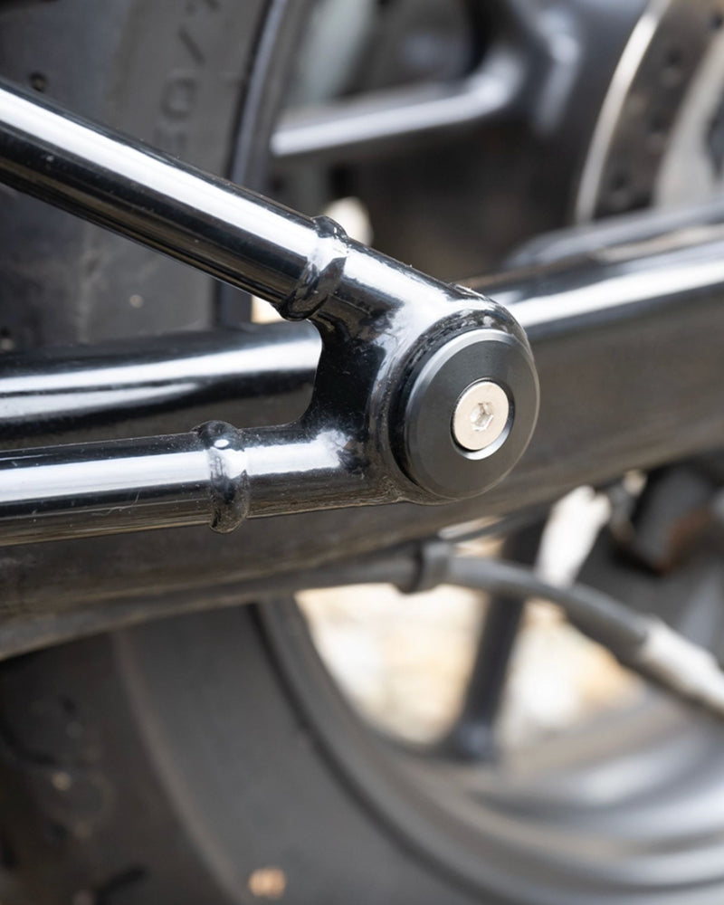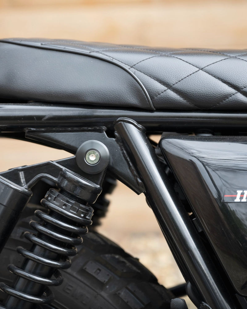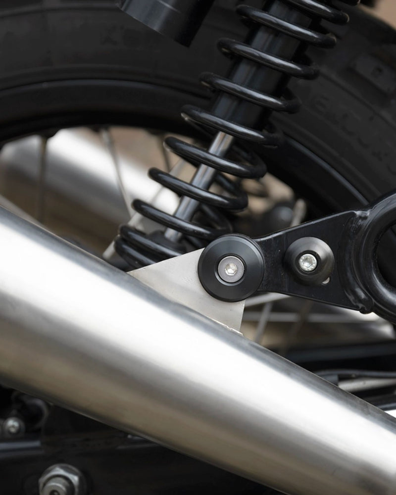 Made from black anodised aluminium, the Royal Enfield Foot Peg Covers & Shock Bolt Dress Up Kit features an improved design with a robust M8 threaded bolt capable of supporting the exhaust’s weight. These covers enhance the refined look of Royal Enfield motorcycles and perfectly complement our bar end finishers. They also serve as dress-up covers for shock mounts, suitable for the top shock mount (excluding the bottom) on Royal Enfield Interceptor 650 and Continental GT650. Additionally, they can blank out the rear passenger footrests on Royal Enfield Meteor 350 and Super Meteor 650. Installation is straightforward and units are sold in pairs.