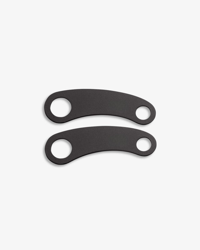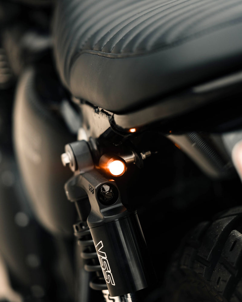 These Shock Mount Indicator Brackets are crafted from stainless steel and finished with a black powder coat, essential for mounting indicators or 3-in-1 signals. They attach at the top shock mount position - either between the shock and the outer bolt or inside between the shock and the frame. The large hole measures 16mm suitable for Triumph, Royal Enfield and many other manufacturers, while the smaller hole is available in 6mm, 8mm, or 10mm sizes to fit various indicator bolts. All of our indicators state the bolt size in their size guide. Sold as a pair.