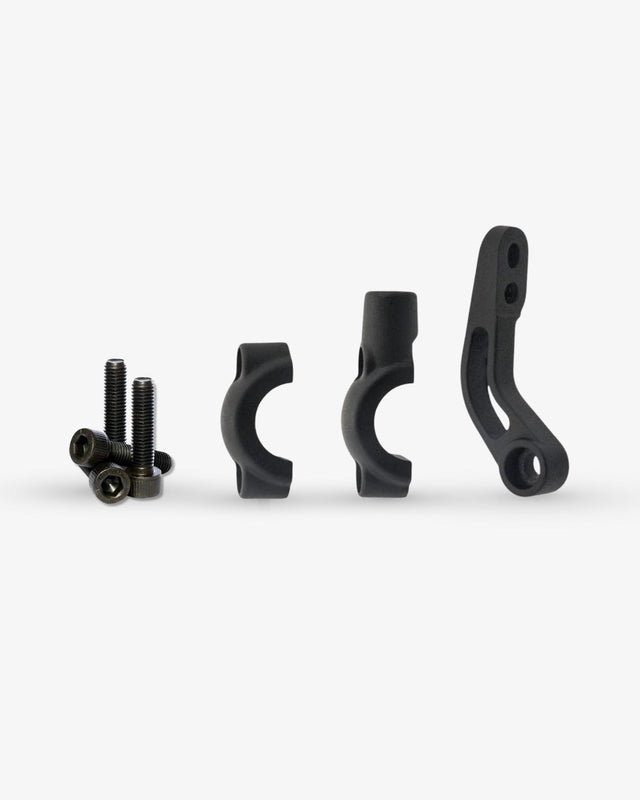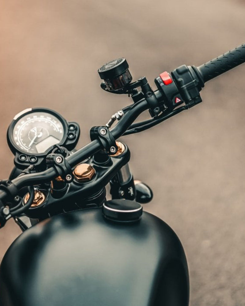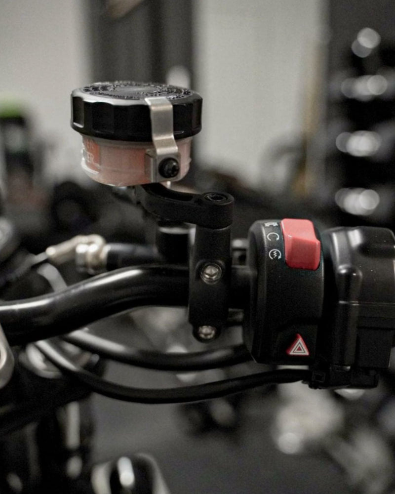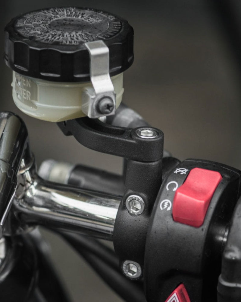 Constructed with anodized black aluminum, this Triumph Mirror Delete & Brake Reservoir Arm Kit replaces the oem mirror brackets left behind when installing bar end mirrors. This kit ensures you maintain tidy handlebars with no unsightly threads that stick up and need plugging as well as a more elegant arm that holds the brake oil reservoir. Fits all of the Bonneville family with 22mm handlebars: Street Twin (2016 and up), Street Scrambler (2017 and up), Scrambler 900 (2021 and up), Speed Twin 900 (2021 and up), Air-cooled Scrambler 900 (2006-2016), Triumph Bonneville SE Mag Wheel (2009-2015).